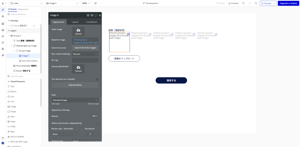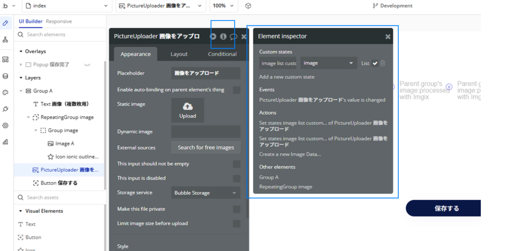 必要なエレメントは、「RepeatingGroup」「PictureUploader」「保存Button」になります。