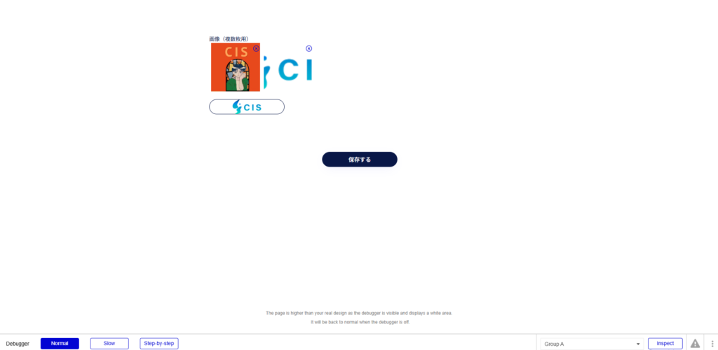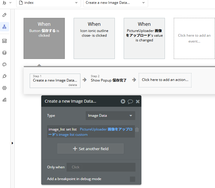 「保存Button」では、「image list custom」をデータベースの「image_list」に保存する設定を行います。